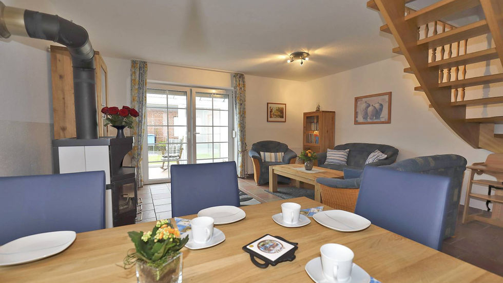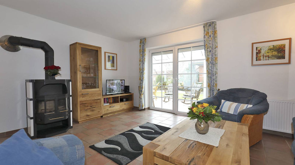 Großzügiges Wohnzimmer mit ca. 30qm Fläche, Sat-TV, WLAN, Terrasse mit Markise, Gartenmöbeln und Grillkamin, Gäste-WC, Abstellraum, Küche mit Geschirrspüler, Mikrowellenherd und Kühlschrank sowie einer Essecke im Erkerbereich.